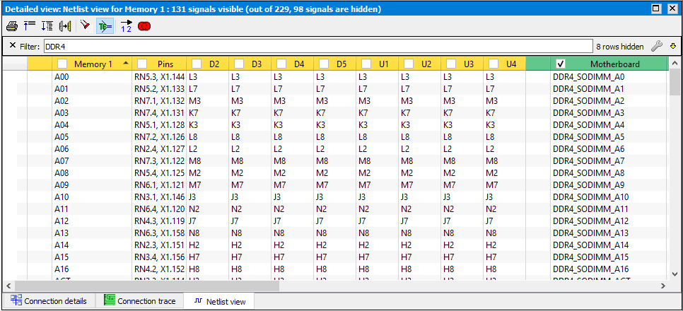 The example above shows a memory board with 8 DDR components connected to the 'Motherboard'. In this BoardTrace netlist view table is easy to see that that signals DDR4_SODIMM_A1 .. DDR4_SODIMM_A16 are connected to the same memory pins, by using sorting and a text filter 'DDR4'.
