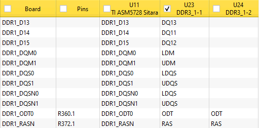 ConnTrace uses pin labels in the columns of the components when available in the PCB netlist format. The pin labels make it easier to verify connectivity. You can add any number of components to the view to easily see how they connect to each other. in the example below it easy to see that data lines D14 and D15 have incorrect connections.