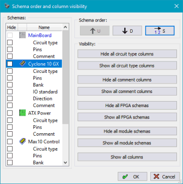 The order of schemas and visibility of the individual columns can be set with a